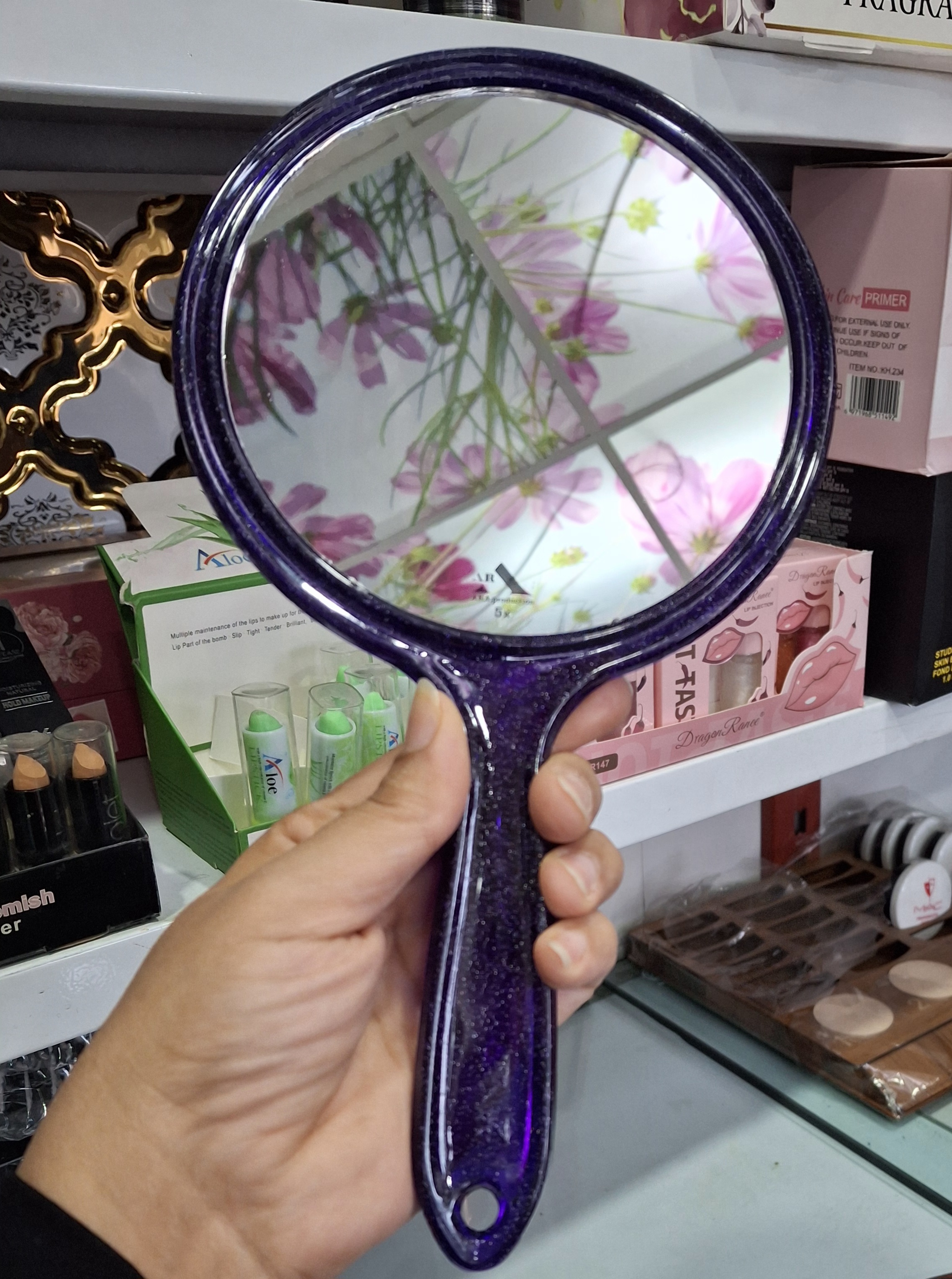 آینه آرایشی دسته‌دار طرح شاین دوطرفه – یک طرف بزرگنمایی (سایز بزرگ L، قطر ۱۴ سانت)