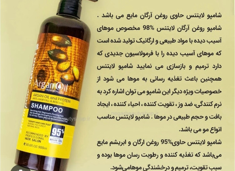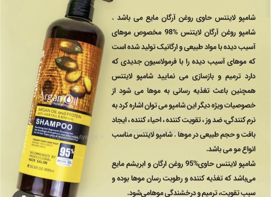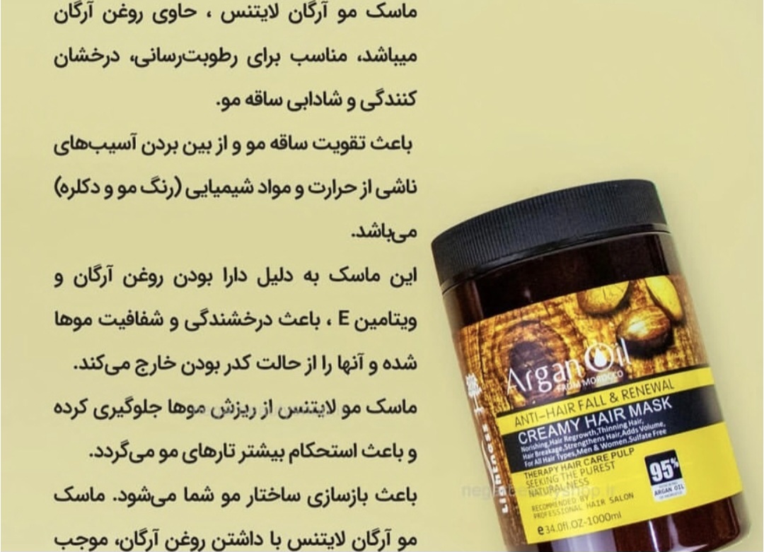 شامپو آرگان لایتنس تقویت کنده و ترمیم کننده مو تغذیه کنده و رطوبت رسان حجم دهنده و درخشان کننده مو برطرف کننده خشکی مو و پوست کمک به رفع موخوره و گره در مو تامین نرمی، لطافت و رطوبت مورد نیاز تقویت و افزایش استحکام انعطاف پذیری ساقه مو تحریک رشد سلولهای پوست سر مناسب استفاده قبل و بعد کراتینه موماسک مو لایتنس مناسب مصرف شخصی و سالن مناسب موهای کراتینه شده رفع خارش پوست سر حاوی عصاره بادام تهیه شده از روغن آرگان و سرشار از ویتامین